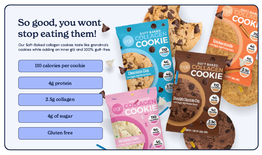Our Soft-Baked collagen cookies taste like grandma’s cookies while adding an inner glō and 100% guilt-free.